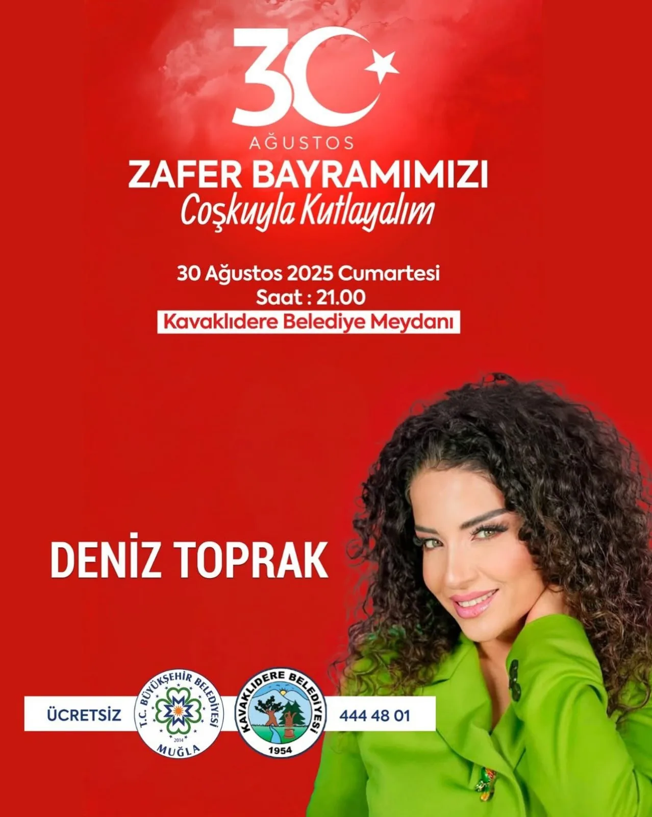Türkiye Cumhuriyeti’nin kurucusu Gazi Mustafa Kemal Atatürk önderliğinde, Türk Milleti’nin azmi, kararlılığı ve fedakârlığı ile kazanılan 30 Ağustos Başkomutanlık Meydan Muharebesi’nin 103.yılı Muğla’da çeşitli konserler ve söyleşilerle kutlanacak. Büyükşehir Belediyesi 30 Ağustos Zafer Bayramı’nda Muğla’nın 3 ilçesinde konserler düzenleyecek. Menteşe Cumhuriyet Meydanı’nda Can Bonomo sevenleri ile buluşurken Seydikemer Seki Meydanı’nda Esra Özmen, Kavaklıdere Belediye Meydanı’nda da Deniz Toprak konserleri vatandaşla buluşacak.