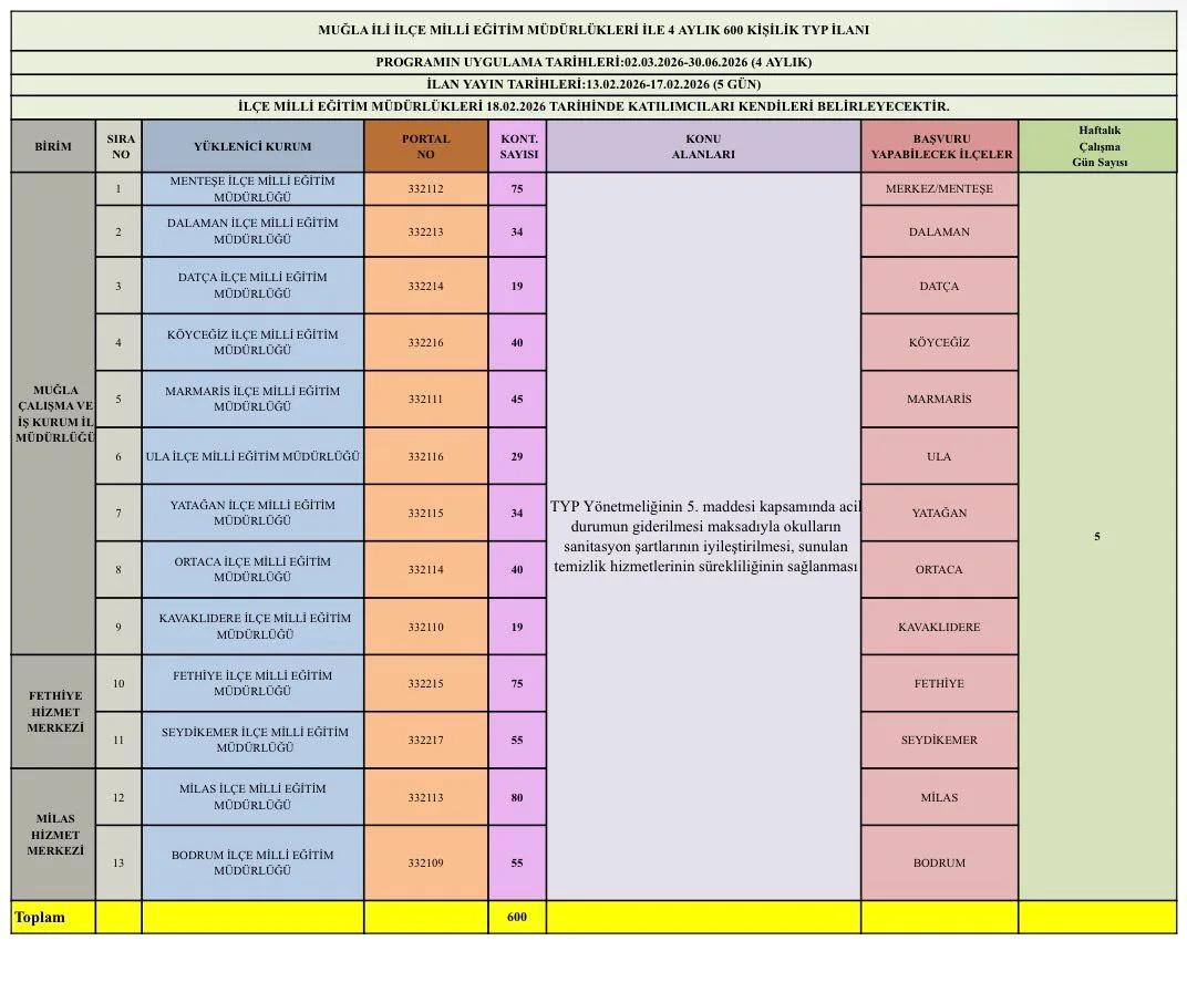 Muğla’da İlçe Milli Eğitim Müdürlükleri’nde istihdam edilmek üzere 4 ay süreli, 600 kişilik Toplum Yararına Program (TYP) ödeneği tahsis edildi. Program kapsamında başvurular 13 Şubat’ta başladı, yarın başvurular için son gün. Başvurular İŞKUR üzerinden alınacak.