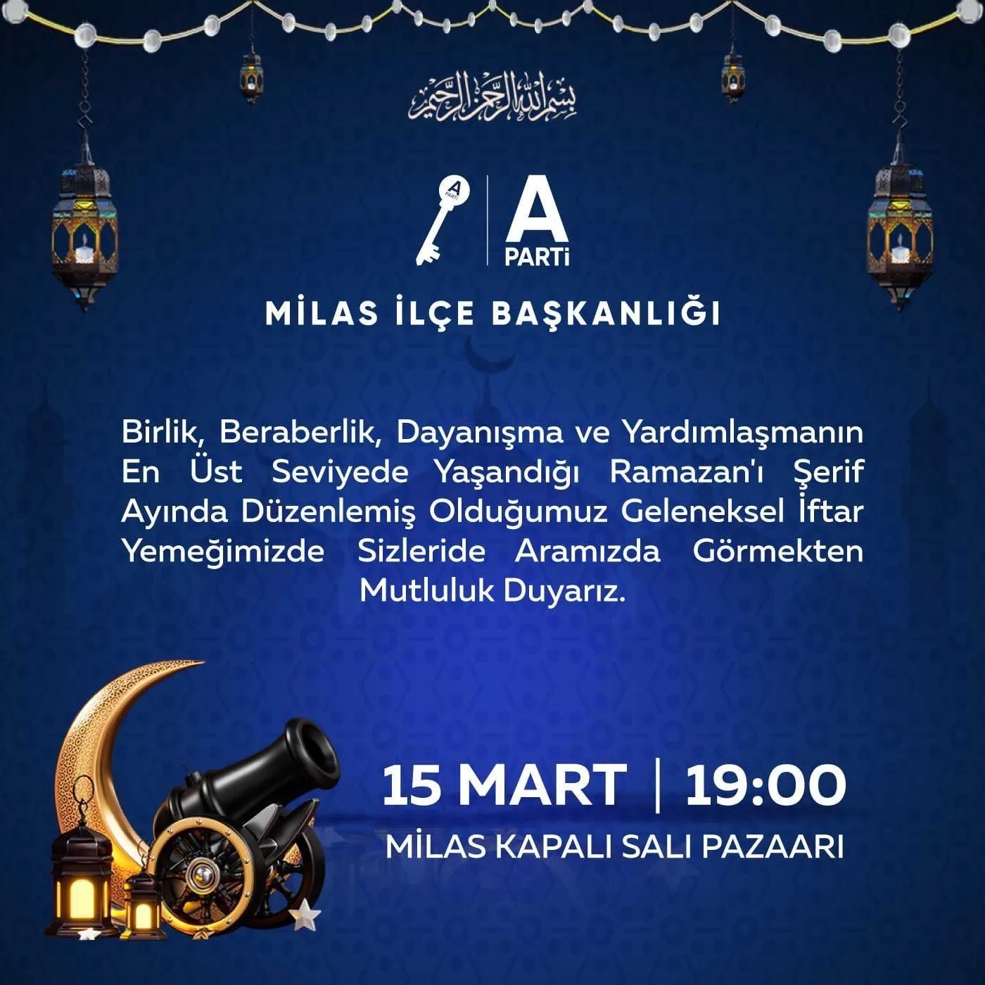 A Parti Milas İlçe Başkanı Hacı Sait İbiçek, tüm Milas halkını düzenlenecek iftar programına davet ederek Ramazan ayının barış, huzur ve kardeşlik duygularını pekiştirmesini temenni etti.