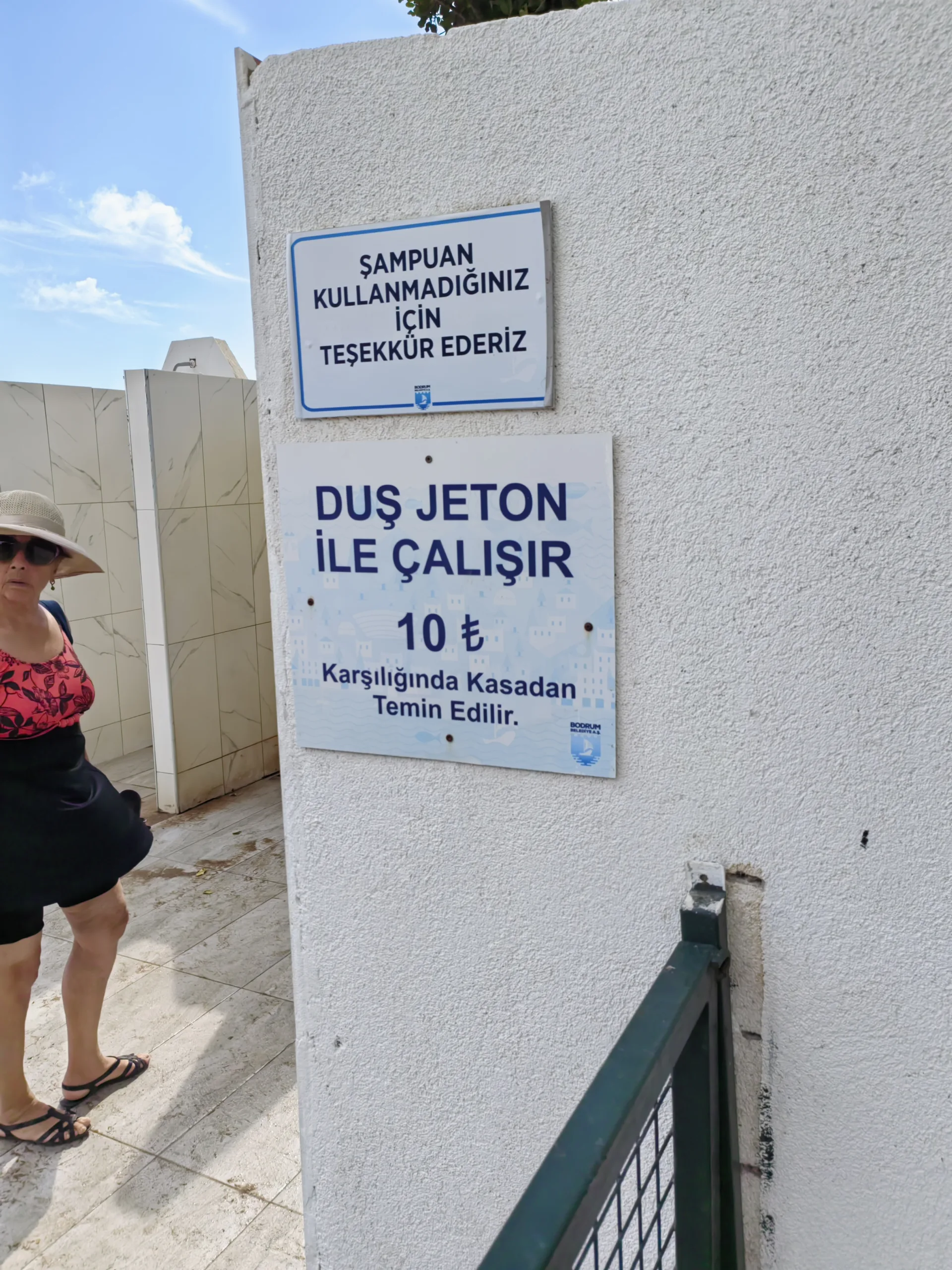 “Duş Jeton ile çalışır 10 TL. karşılığında kasadan temin edilir.” yazısı…