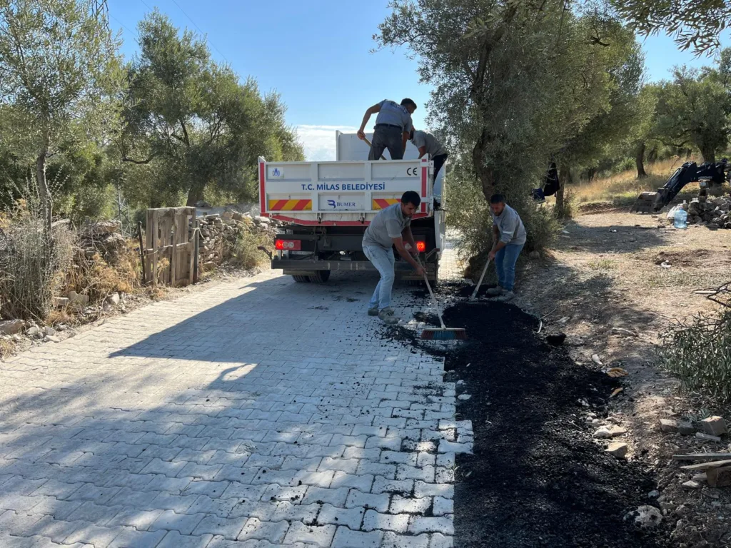 Milas Belediyesi Fen İşleri Müdürlüğü ekipleri Kıyıkışlacık Mahallesi’nde 870 m² kilit parke yol kaplama, Boğaziçi Mahallesi Çok Amaçlı Sosyal Alan yan yol rodmiks serme işi, Pinar Mahallesi Aile Sağlığı Merkezi 140 m² kilit parke, 44 m bordür, 13 m² karo, 2 mᶾ çiçeklik içi toprak dökümü uygulaması, Akçakaya Mahallesi’nde mezarlık alanı içinde malzeme deposu inşaatı ve sıvama uygulamaları, Çamköy Çok Amaçlı Sosyal Alan’da tuvalet, gelin odası ve yemek pişirme yeri, Sakarkaya Mahallesi tuvaletinde 60m² seramik kaplama, boya badana, tesisat ve kapı montaj işleri, Gümüşlük Mahallesi (Sarıçay kenarı) lastik depolama alanı düzenleme ve 50 m 400’lük büz koyma işi, Hüsamlar Mahallesi’nde ise 70 m² taş duvar ve 350 m² kilit parke uygulamasını tamamlayarak vatandaşların hizmetine sundu.