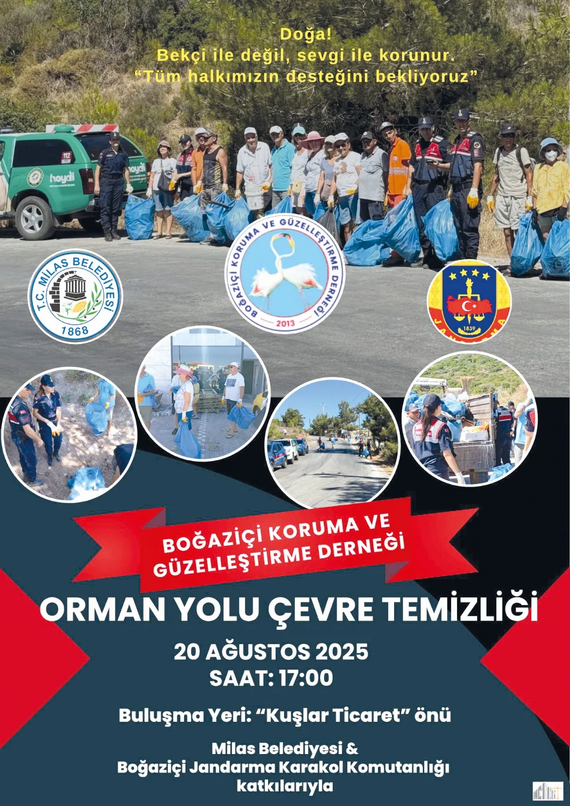 Boğaziçi Koruma ve Güzelleştirme Derneği, “Doğa! Bekçi ile değil, sevgi ile korunur” sloganıyla 20 Ağustos Çarşamba günü çevre temizlik etkinliği düzenliyor. Etkinlik, Milas Belediyesi ve Jandarma iş birliğiyle gerçekleştirilecek.