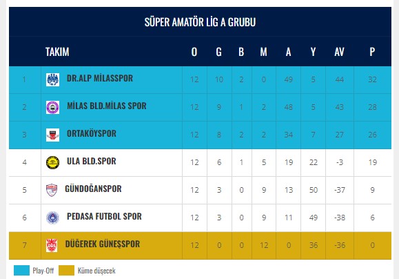 Play off müsabakaları için B grubunda ise 14 haftanın galibi Ortaca Belediyespor oldu. 32 puanla grubu lider tamamlayan Ortaca Belediyespor’u, 30 puanla Marmaris Gençlik Spor AŞ ve 25 puanlı Seydikemer Spor takip etti.