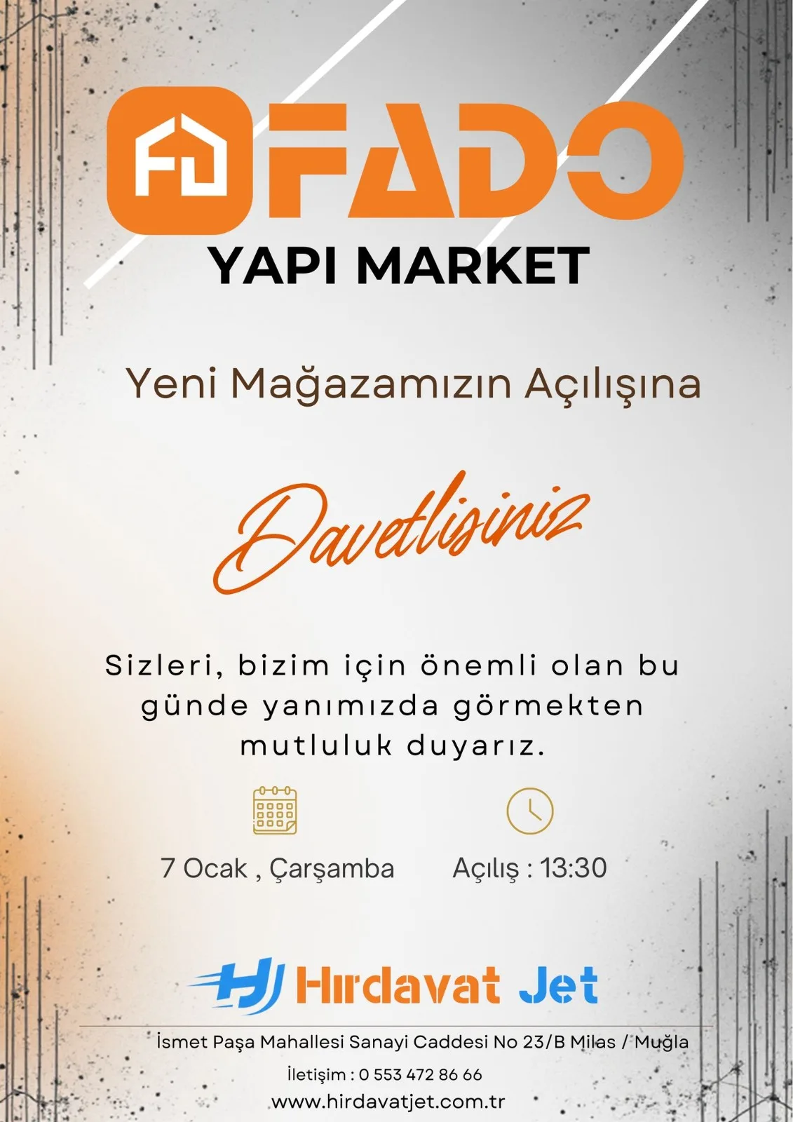 Hırdavat Jet markasıyla da hizmet verecek olan Fado Yapı Market, bu özel günde tüm Milas halkını açılış coşkusunu paylaşmaya davet ediyor.