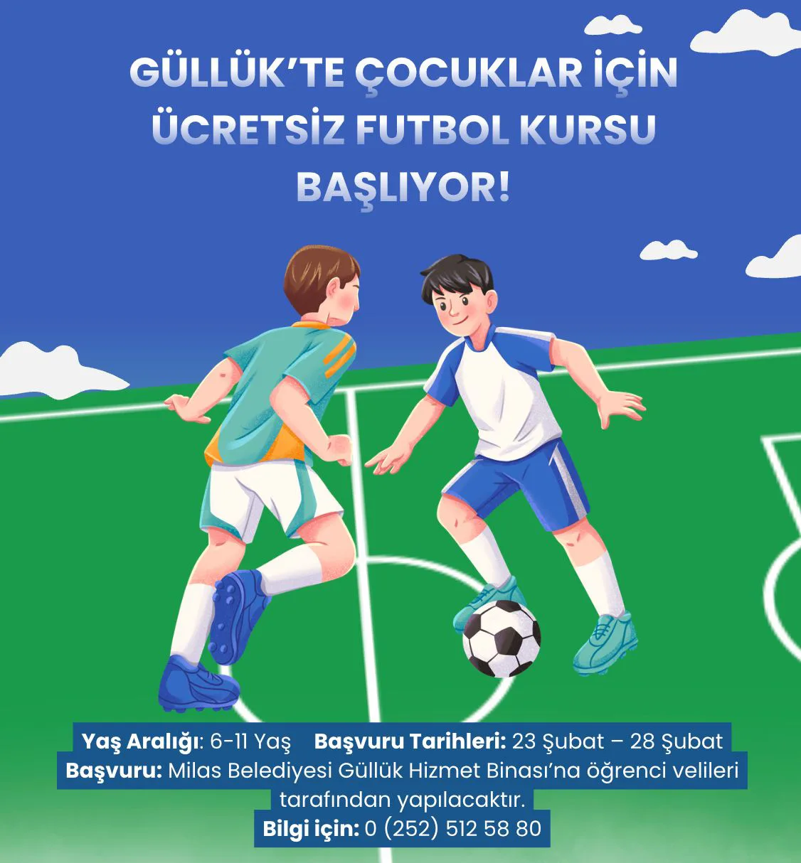 Kontenjanın sınırlı olduğu 6-11 yaş arası çocukların katılabileceği futbol kursları ücretsiz olarak gerçekleşecek. Geleceğin yetenekli futbolcu adaylarını misafir edecek olan kurslara kayıt yaptırmak ve bilgi almak isteyen vatandaşlarımız Milas Belediyesi Güllük Hizmet Binası’na başvuru yapıp 0(252) 512 58 80 numaralı telefonu arayabilecek.