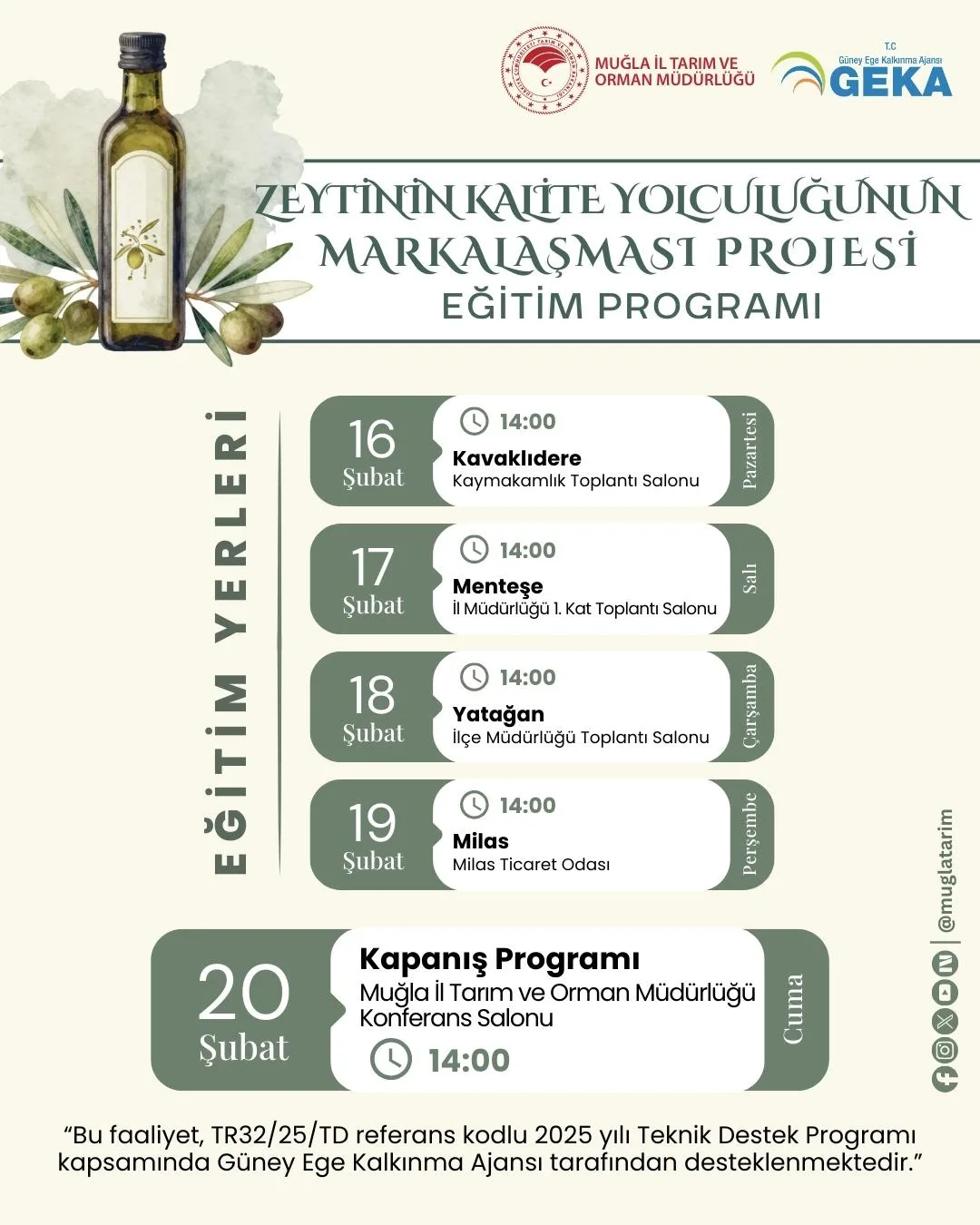 “Zeytinyağında kaliteyi artırmak ve ürünlerimizi markalaştırarak daha güçlü bir ekonomik değer oluşturmak istiyorsak, eğitimler büyük önem taşımaktadır. Tüm üreticilerimizi, özellikle kadın üreticilerimizi bu eğitim programlarına katılmaya davet ediyorum. Bilgiyle güçlenen üretim, Muğla zeytinyağının geleceğini daha da sağlamlaştıracaktır.”