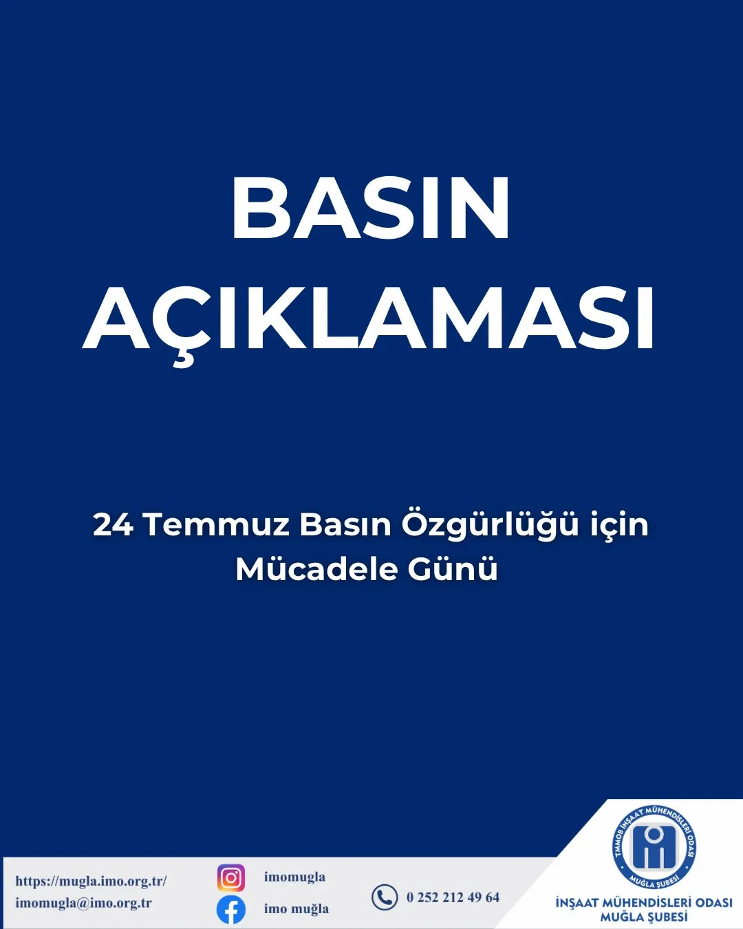 ​24 Temmuz Basın Özgürlüğü için Mücadele Günü dolayısıyla TMMOB İnşaat Mühendisleri Odası (İMO) Muğla Şubesi Yönetim Kurulu, önemli bir açıklama yayımladı. Açıklamada, basının demokratik toplumlar için vazgeçilmez bir unsur olduğu vurgulanırken, Türkiye’deki basın özgürlüğüne yönelik baskılara dikkat çekildi.