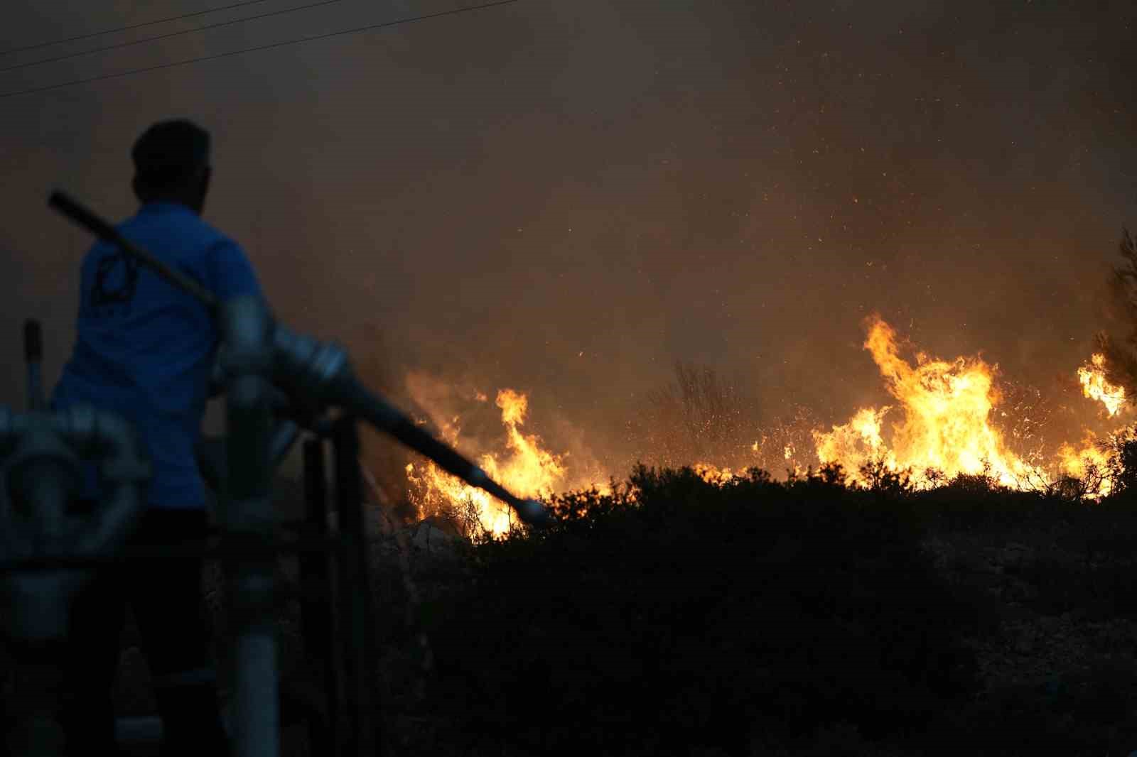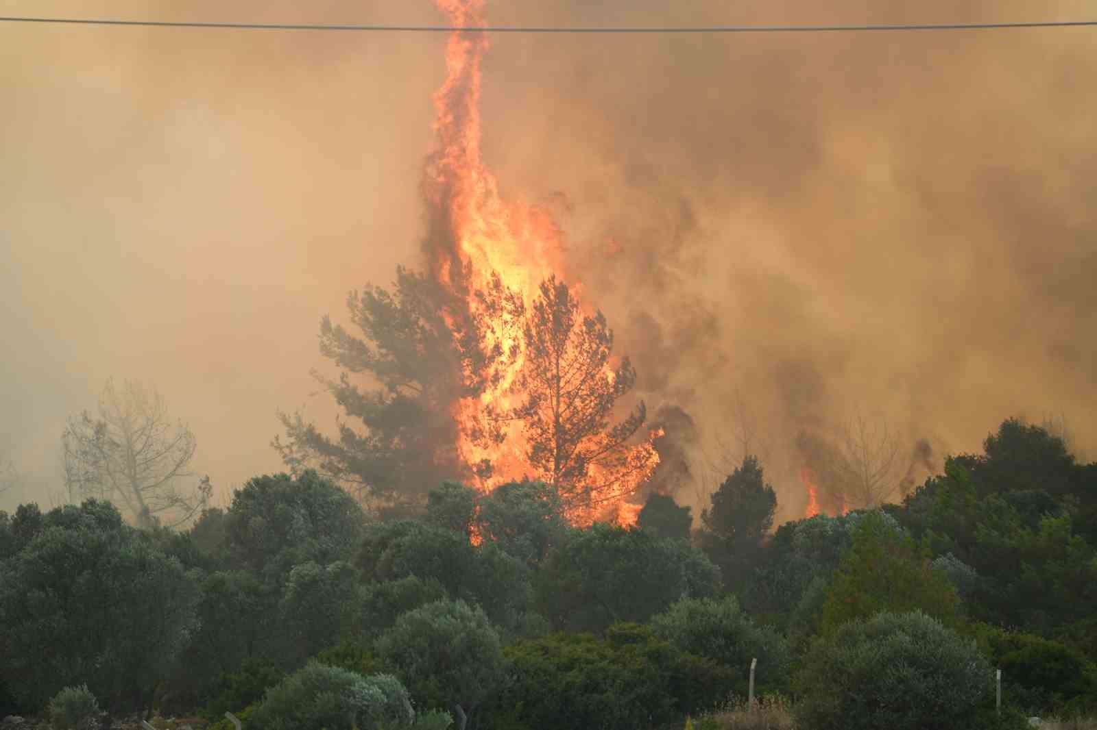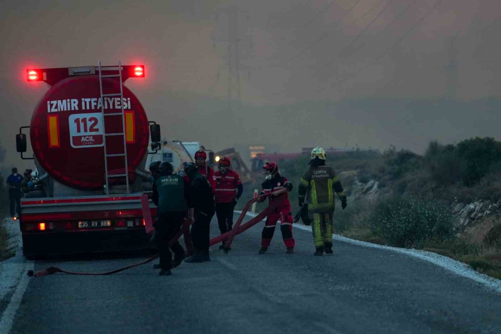 İzmir’in Çeşme ilçesinde, zirai bölgede başlayıp ormanlık alana yayılan yangını söndürme çalışmaları aralıksız devam ediyor.