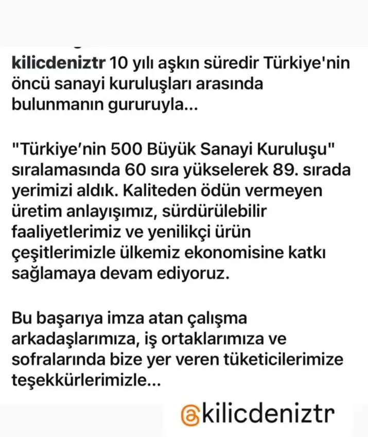“Türkiye’nin 500 Büyük Sanayi Kuruluşu sıralamasında bu yıl 60 sıra birden yükselerek 89. sırada yerimizi aldık. Kaliteden ödün vermeyen üretim anlayışımız, sürdürülebilir faaliyetlerimiz ve yenilikçi ürün çeşitlerimizle ülkemiz ekonomisine katkı sağlamaya devam ediyoruz. Bu başarıya imza atan çalışma arkadaşlarımıza, iş ortaklarımıza ve sofralarında bize yer veren tüketicilerimize teşekkür ederiz.”