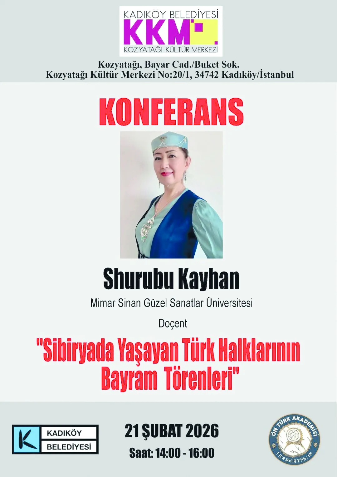 Not: Doçent Shurubu Kayhan, Sibirya’da Yaşayan Türk halklarının bayram törenleri konusunda bir  konferans verecek. Tarih: 21 Şubat 2026 Cumartesi Yer: Kozyatağı, Bayar Cad. Buket Sok. Kozyatağı Kültür Merkezi No 201/1 Kadıköy – İSTANBUL