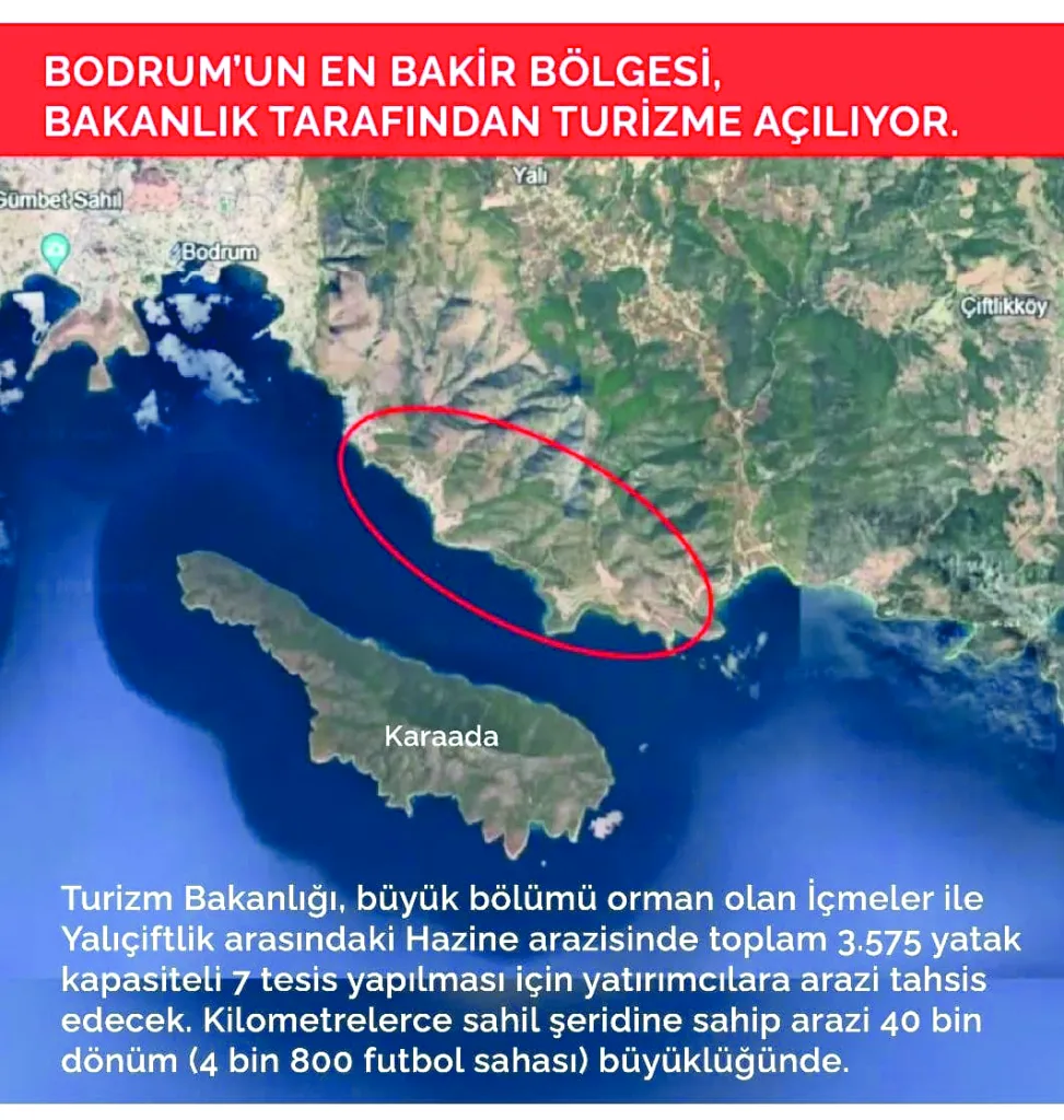 “Bodrum’un en bakir bölgesi, bakanlık tarafından turizme açılıyor! Turizm Bakanlığı, büyük bölümü orman olan İçmeler ile Yalıçiftlik arasındaki Hazine arazisinde toplam 3575 yatak kapasiteli 7 tesis yapılması için yatırımcılara arazi tahsis edecek. Kilometrelerce sahil şeridine sahip arazi 40 bin dönüm (4 bin 800 futbol sahası) büyüklüğünde.