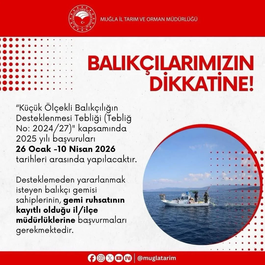 Muğla İl Tarım ve Orman Müdürlüğü tarafından yapılan duyuruya göre, “Küçük Ölçekli Balıkçılığın Desteklenmesi Tebliği (Tebliğ No: 2024/27)” kapsamında 2025 yılı destek başvuruları, 26 Ocak – 10 Nisan 2026 tarihleri arasında kabul edilecek.