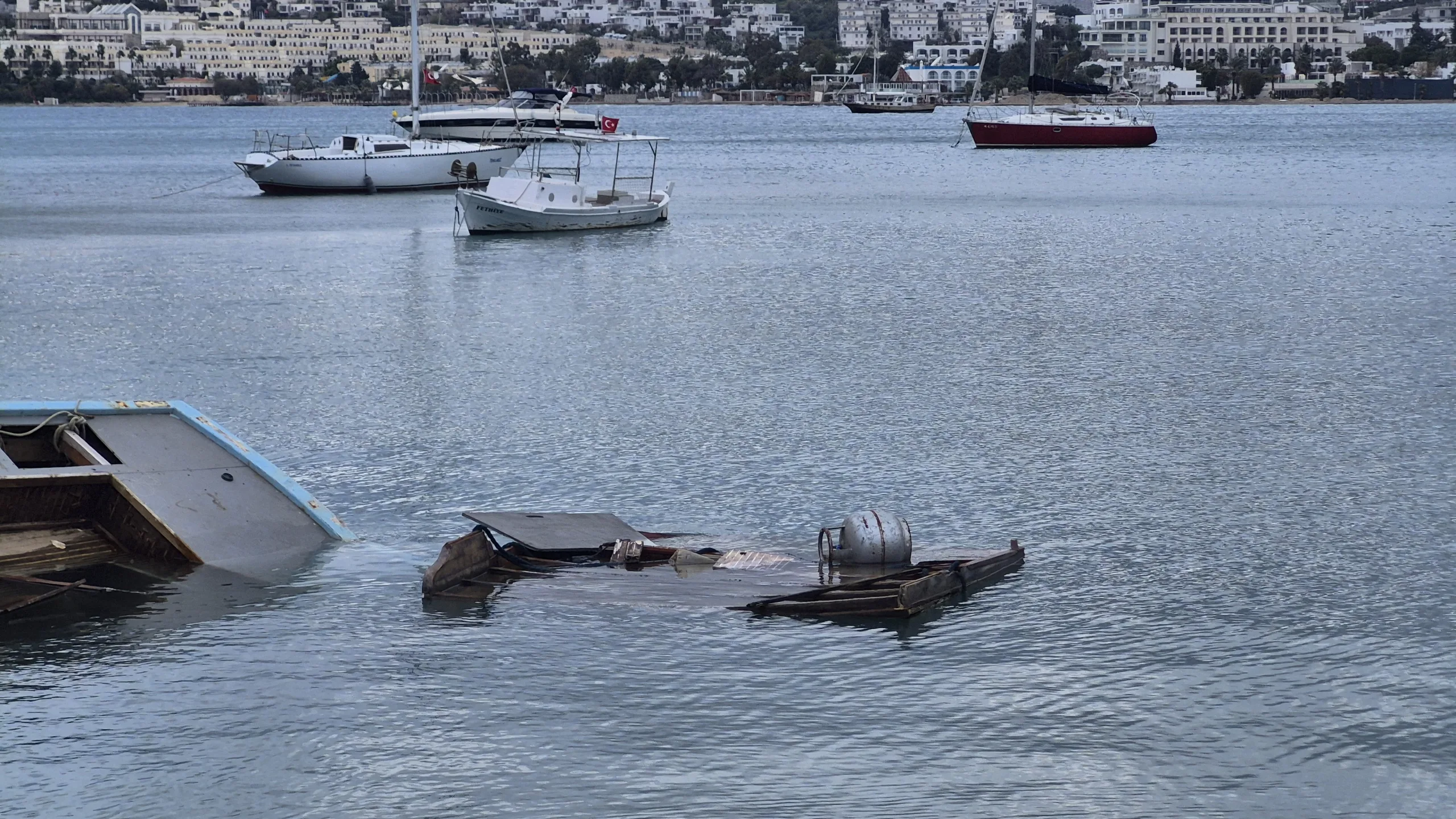 İlçede etkili olan kuvvetli rüzgar günlük yaşamı olumsuz etkiledi. Gümbet Koyu’nda bağlı haldeki 13 metre boyundaki yelkenli tur teknesi, dalgaların etkisiyle su aldı. Yarı batık haldeki teknenin bazı parçalarının da kırıldığı ve denize düştüğü görüldü. Tahta parçalarının üzerindeki bir tüp de göze çarptı. Ağır hasar alan ve ön kısmı yanındaki tekneye dayanan yelkenli kurtarılmayı bekliyor.