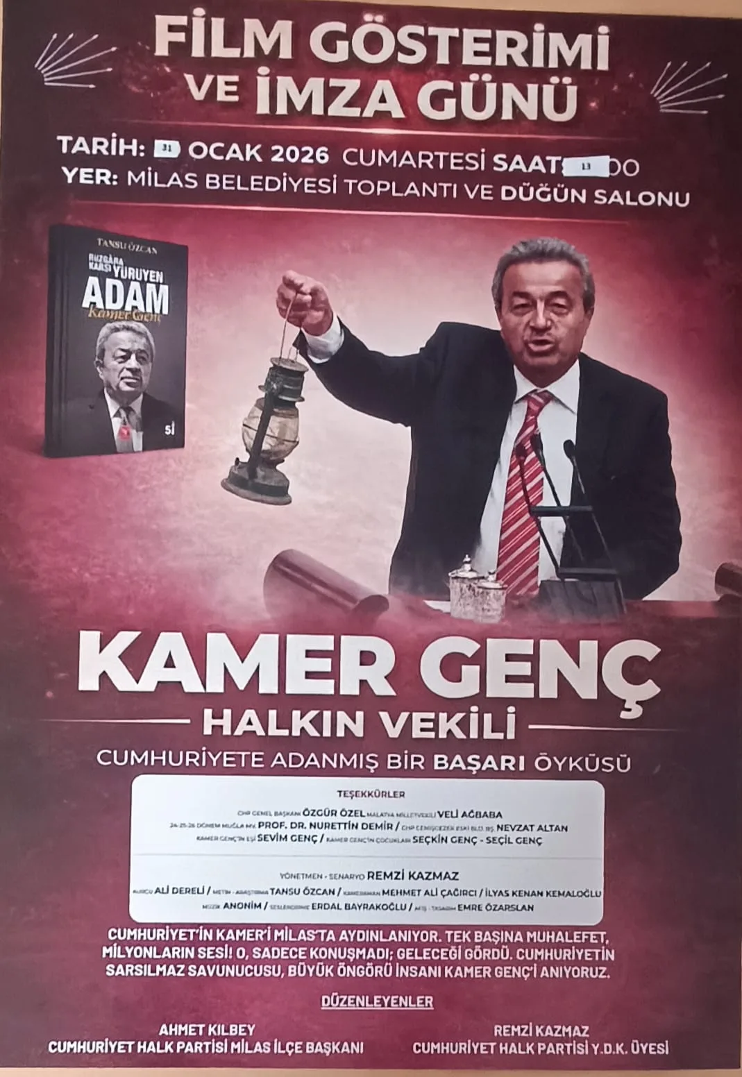 Cumhuriyet değerlerine olan sarsılmaz bağlılığı, halktan yana duruşu ve Meclis kürsüsünden yükselen güçlü sesiyle hafızalara kazınan Kamer Genç’in yaşamını konu alan etkinlik, Milaslıları yakın tarihin önemli tanıklarından biriyle buluşturacak. Film gösteriminin ardından düzenlenecek imza gününde, Kamer Genç’in mücadelesini ve siyasi mirasını anlatan eserler okurlarla buluşacak.
