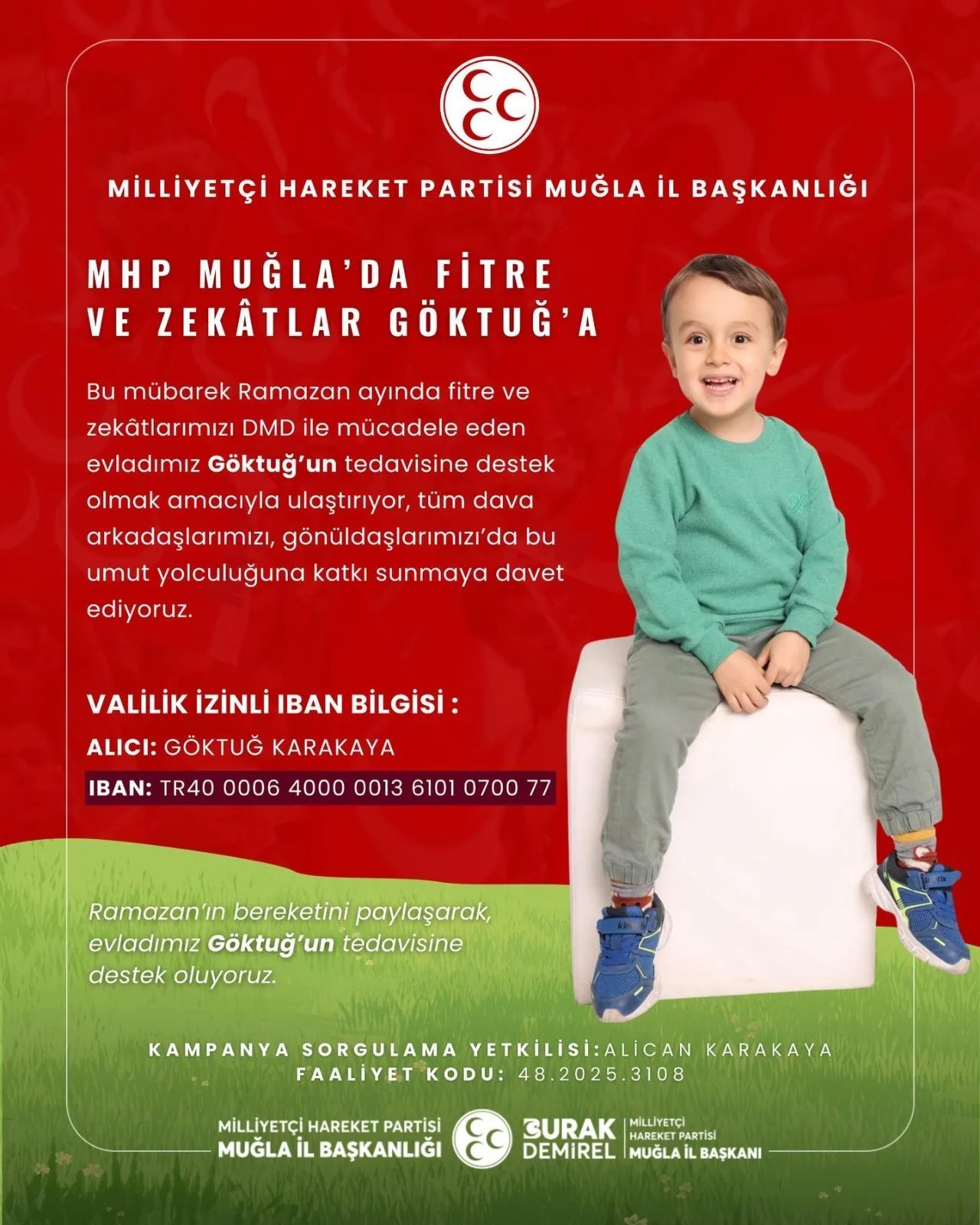 MHP Muğla İl Başkanı Burak Demirel öncülüğünde başlatılan bu anlamlı kampanya, Ramazan ayı boyunca hayırsever vatandaşlarımızın desteğiyle Göktuğ Karakaya ve Göktuğ Kurt’un tedavi sürecine katkı sunmayı hedeflemektedir.