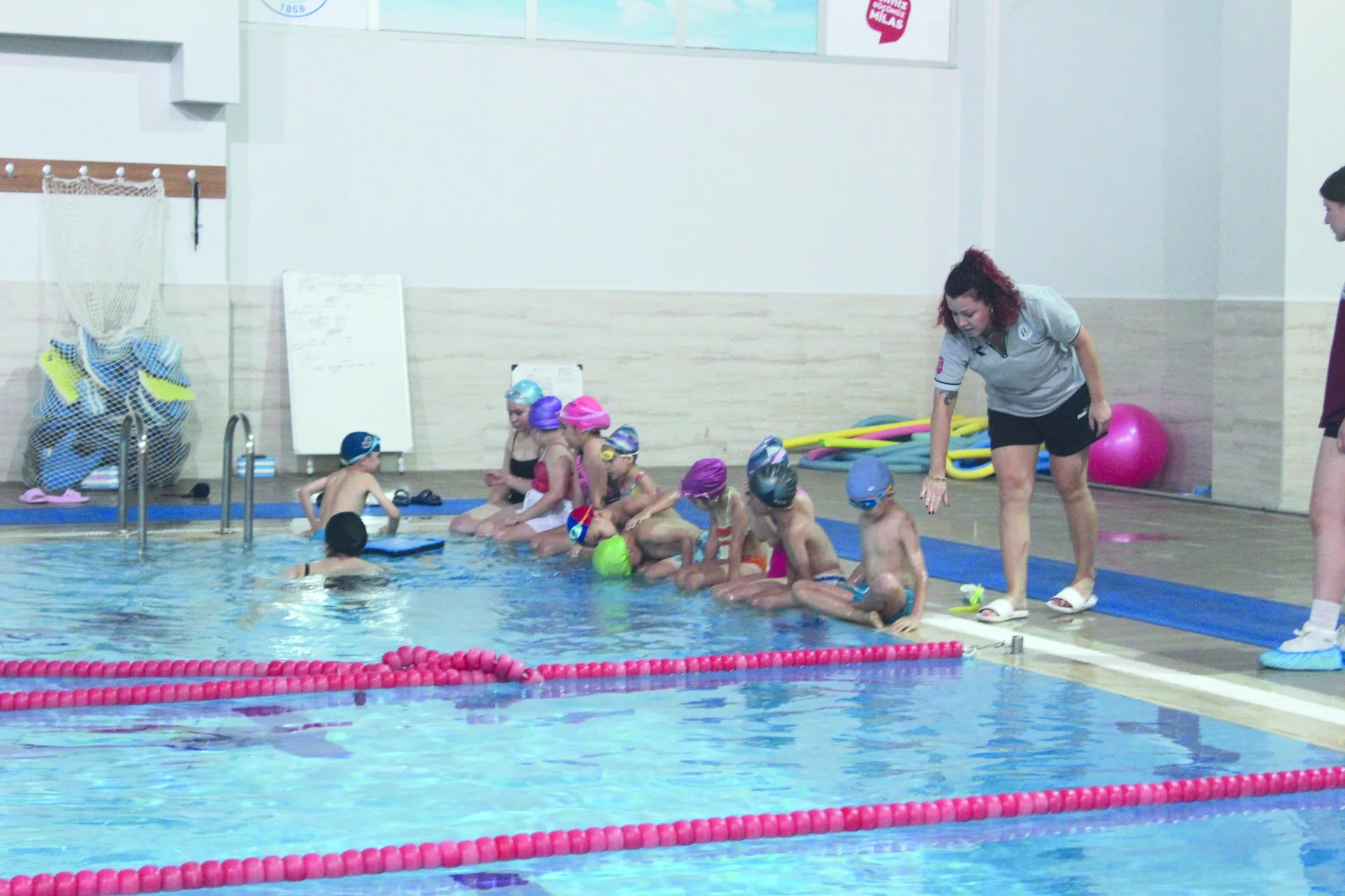 Milas Belediye Atatürk Kapalı Spor Salonu bünyesindeki modern yüzme havuzunda, minik sporcular alanında uzman antrenörler eşliğinde yüzme tekniklerini öğreniyor.