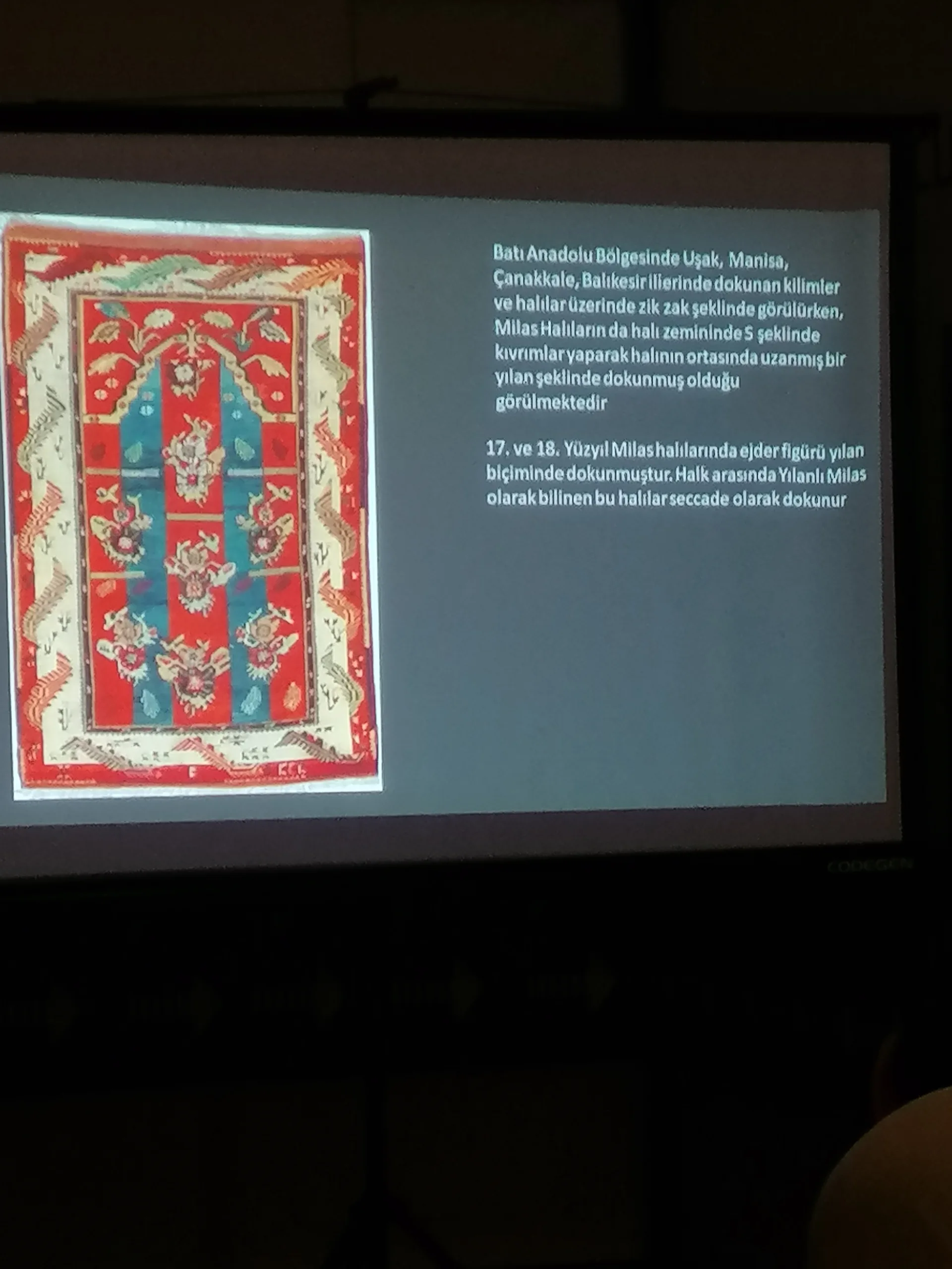 Sunumun odak noktalarından biri de Milas halılarındaki hayvan sembolleriydi. 17. ve 18. yüzyıla tarihlenen bazı Milas halılarında yer alan yılan ve ejder figürlerine dikkat çeken Sevinç, “Yılanlı Milas” olarak bilinen halı örneklerinde, yılan sembolünün bazen bereket ve güç, bazen de kötülükle ilişkilendirildiğini belirtti. Bu halıların genellikle seccade olarak dokunduğunu ve figürlerin halı zeminine anlam yükleyerek yerleştirildiğini aktardı.