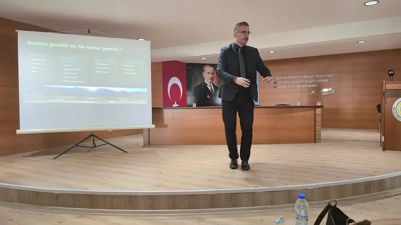 Doç. Dr. Ceyhun Özçelik, tarımsal sulamada yapılan hataları ve modern yöntemlerin uygulanışını katılımcılara aktardı. Özçelik, doğru sulama tekniklerinin verimlilik üzerinde doğrudan etkisi olduğunu vurguladı.