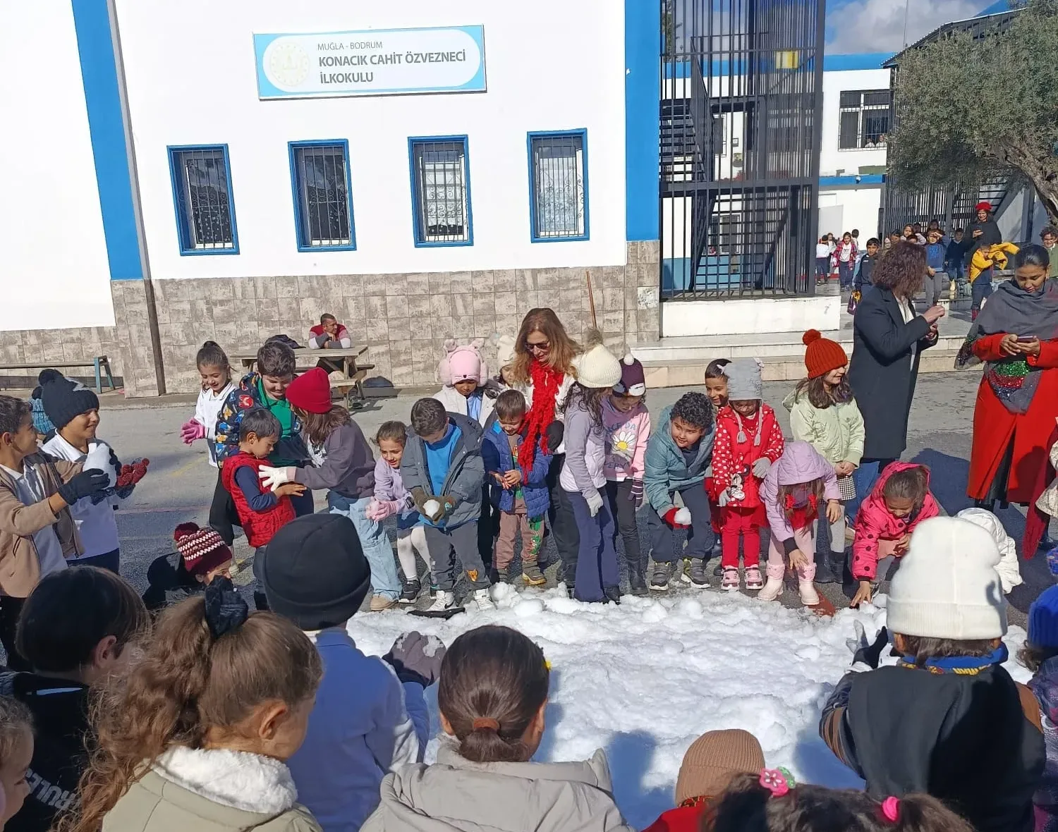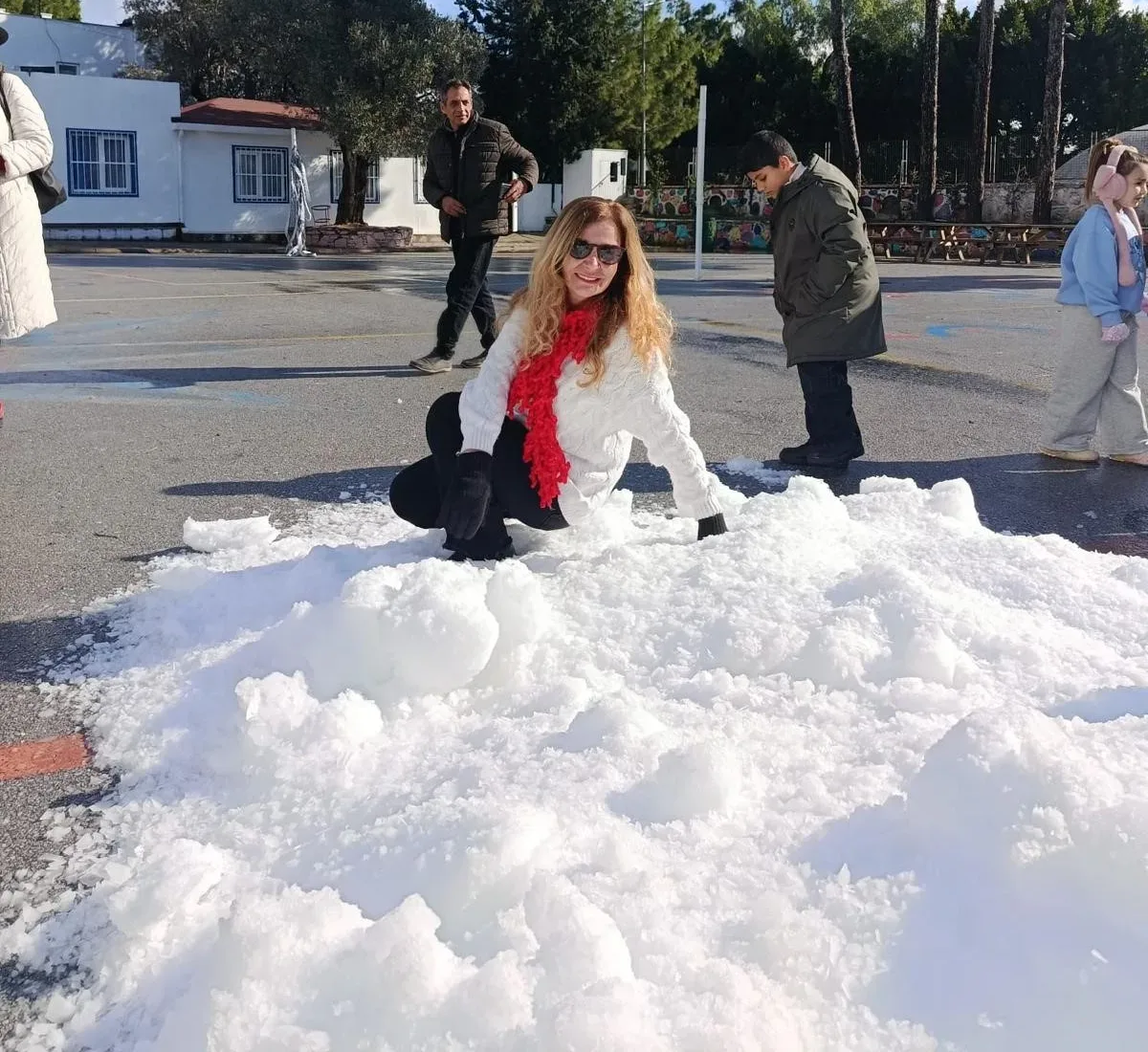 Bodrum ilçesinde bir ilkokula getirilen yapay kar ile çocuklar gönüllerince eğlendi.