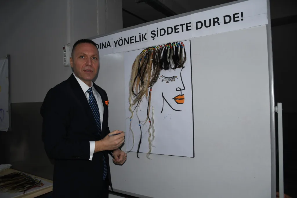 Etkinliğin en dikkat çeken çalışması ise şiddet gören kadını sembolize eden kadın figürü oldu. Güzellik ve Saç Bakım Hizmetleri Bölümü öğrencilerinin kesilen saçlardan hazırladığı materyaller, figürün üzerinde kullanıldı. Katılımcılar bu figüre imza atarak şiddete karşı birliktelik mesajı verdi.