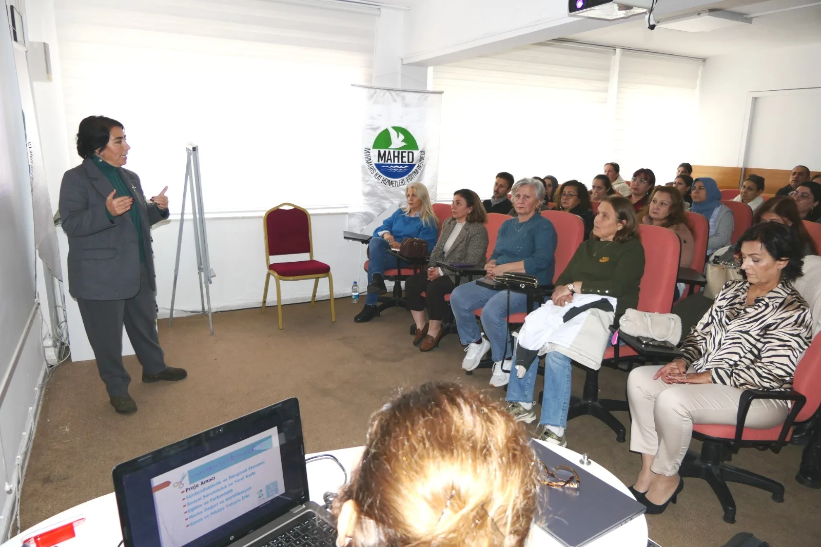 MAHED Başkanı Ayla Yarıcı ev sahipliğinde Marmaris Esnaf ve Sanatkarlar Odası salonunda gerçekleşen seminerde, konuşmacı MATOB Denetim Kurulu Başkanı ve Kat Hizmetleri Eğitim Uzmanı Nezahat Kaymak; Otellerdeki tekstil atıklarının en iyi şekilde geri dönüşüm projeleri ile tekrar kullanıma kazandırılmasının, sürdürülebilir turizmin bir parçası olduğuna dikkat çektiği, Kumaşın Yeniden Doğuşu adlı sunumunda, Geri dönüşüm modelleri, Döngüsel ekonomiye sağladığı katkı, sosyal sorumluluğa faydası, sürdürülebilir turizme sağladığı katkı, atıktan değere maliyetlere sağlayacağı katkı ve tekstil geri dönüşümü yapacak olan kadın kooperatifleri ile yapılacak iş birliğiyle özellikle işsiz ev kadınlara sağlayacağı yeni iş imkanları konularında bilgi verdi.