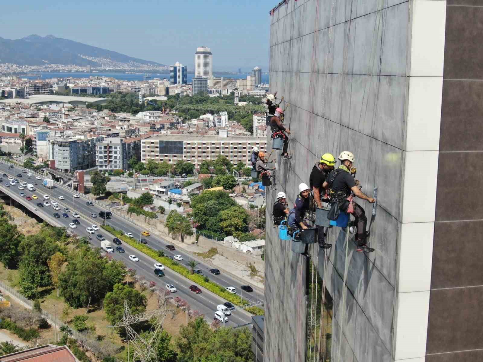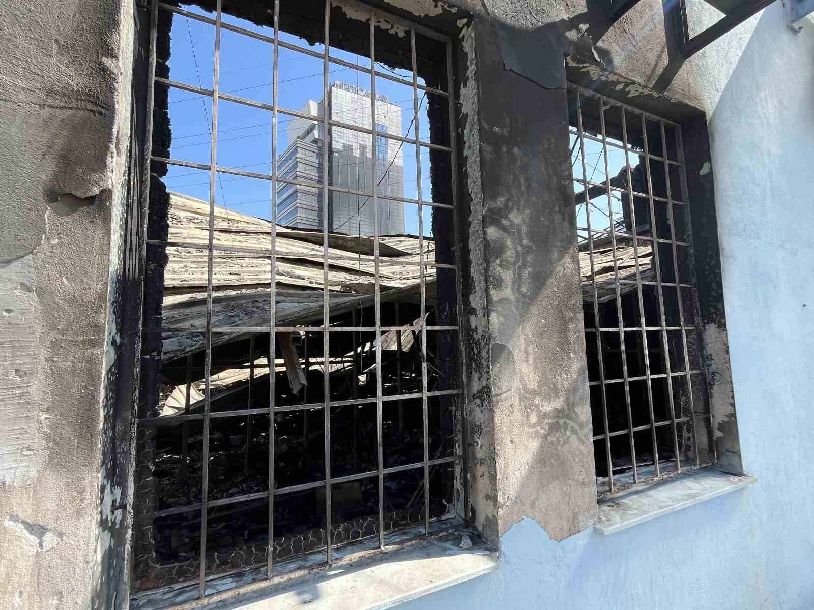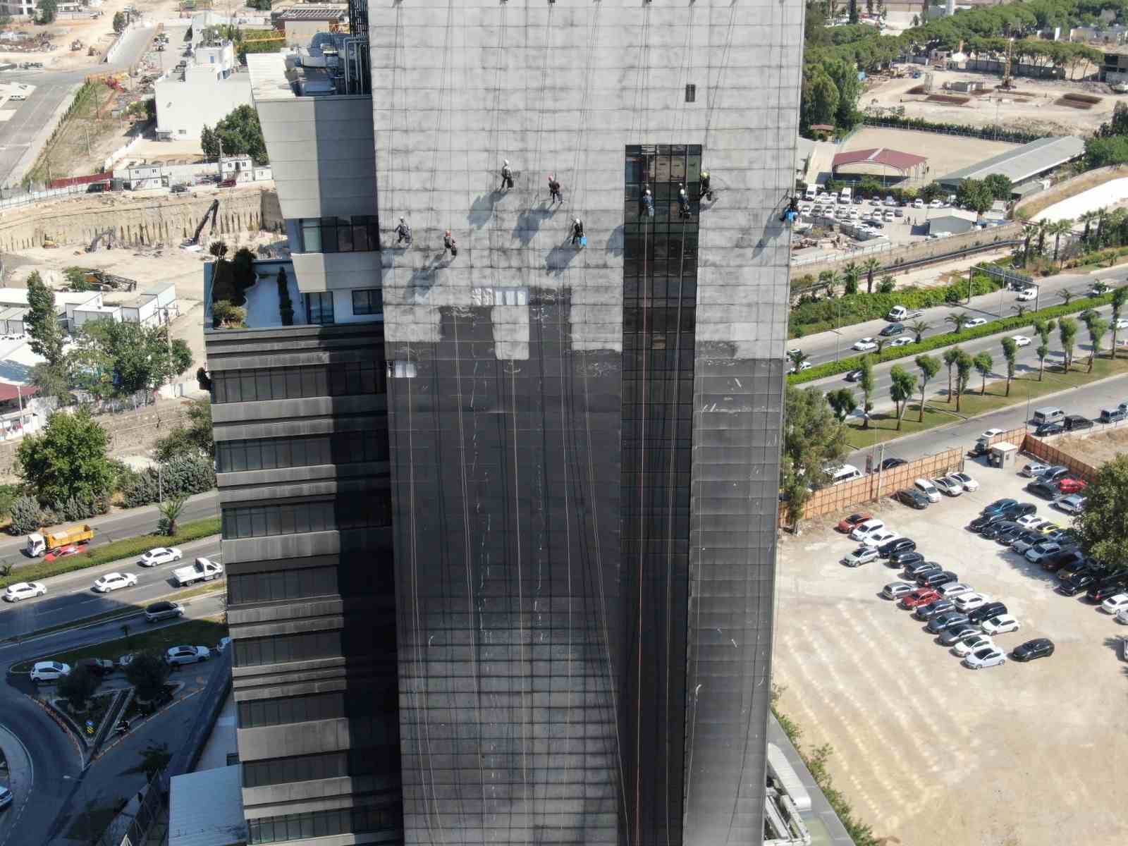 İzmir’in Konak ilçesinde özel hastane bitişiğinde bir fabrikaya ait plastik deposunda çıkan yangının verdiği hasar havadan görüntülendi. 89 hastanın tahliyesine neden olan yangın sonrası dumanlardan kirlenen hastanenin dış cephesinde işçiler temizlik yaparken, hastanede hasta kabulüne yeniden başlandı.