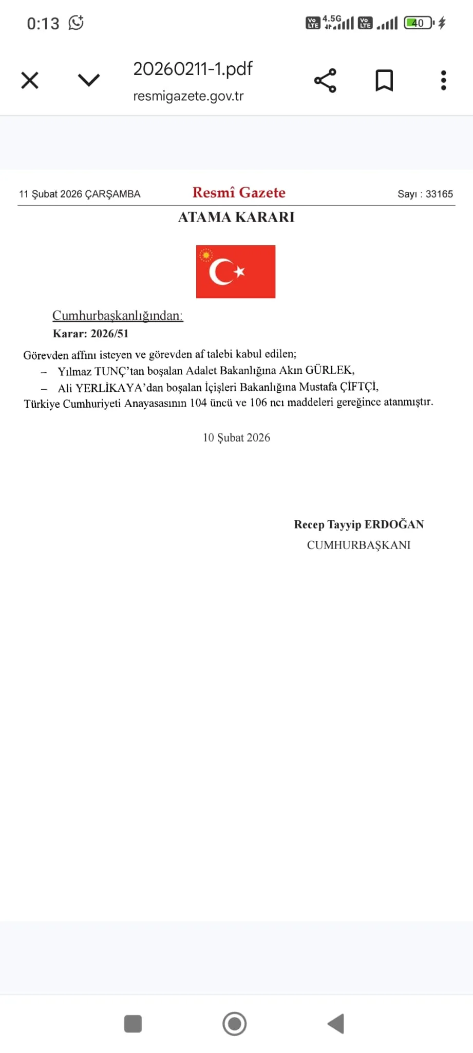 11 Şubat 2026 tarihli ve 33165 sayılı Resmî Gazete’de yayımlanan Cumhurbaşkanlığı Atama Kararı ile Adalet ve İçişleri Bakanlıklarında görev değişimi yapıldı. Cumhurbaşkanı Recep Tayyip Erdoğan’ın imzasıyla yayımlanan 2026/51 sayılı karar kapsamında iki önemli bakanlık görevine yeni isimler atandı.