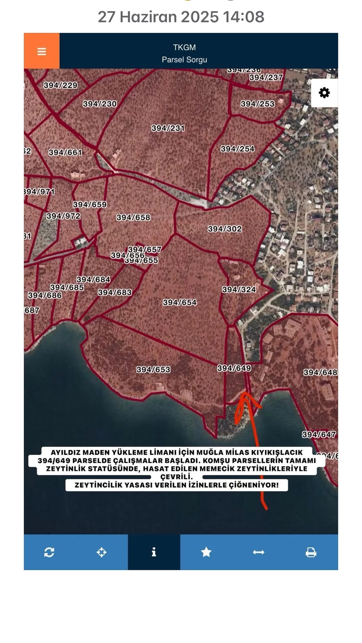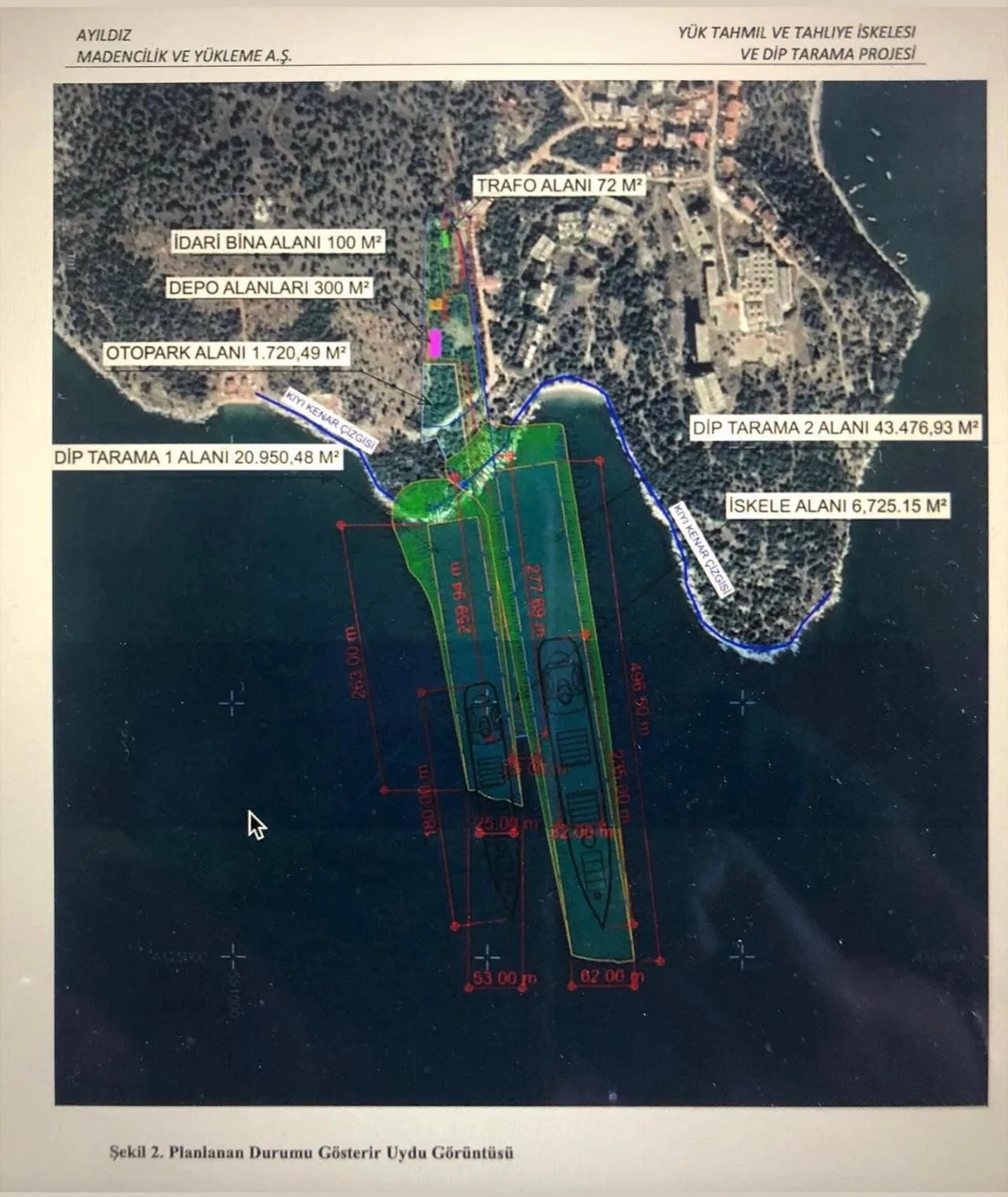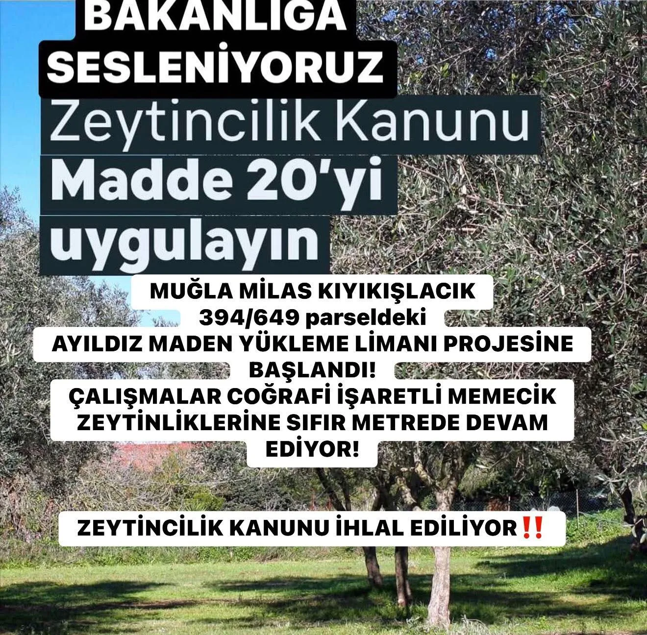 İasos Mahalle Meclisi Derneği’nin yaptığı açıklamaya göre, 394 Ada 649 Parsel üzerinde bulunan ve “Ayıldız Maden Yükleme ve Tahliye Limanı Projesi” adı altında yürütülen faaliyetler, Şubat ayından bu yana 7 gün 24 saat kesintisiz olarak sürüyor. Üstelik bu faaliyetler, coğrafi işaret tesciline sahip olan Memecik zeytinliklerinin sıfır noktasında gerçekleştiriliyor.