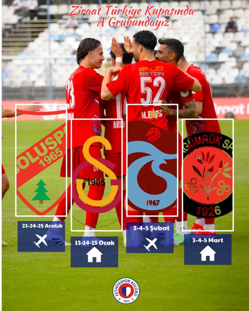 Kupada A Grubu’nda mücadele edecek Fethiyespor, kura çekiminin ardından güçlü rakiplerle eşleşti. A Grubu’nda Galatasaray, Trabzonspor, Başakşehir FK, Alanyaspor, Fatih Karagümrük, Boluspor ve İstanbulspor yer alıyor.